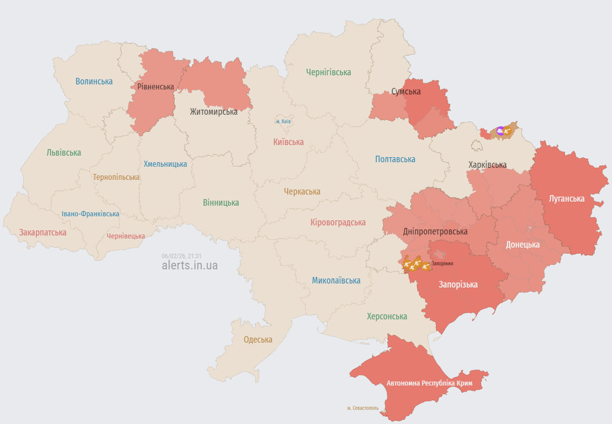 Увечері 6 лютого низка областей України опинилася під загрозою ударів з боку російських окупаційних військ. Зафіксовано рух ворожих безпілотників у напрямку північних та центральних регіонів, а також пуски керованих авіаційних бомб по території Донецької області.