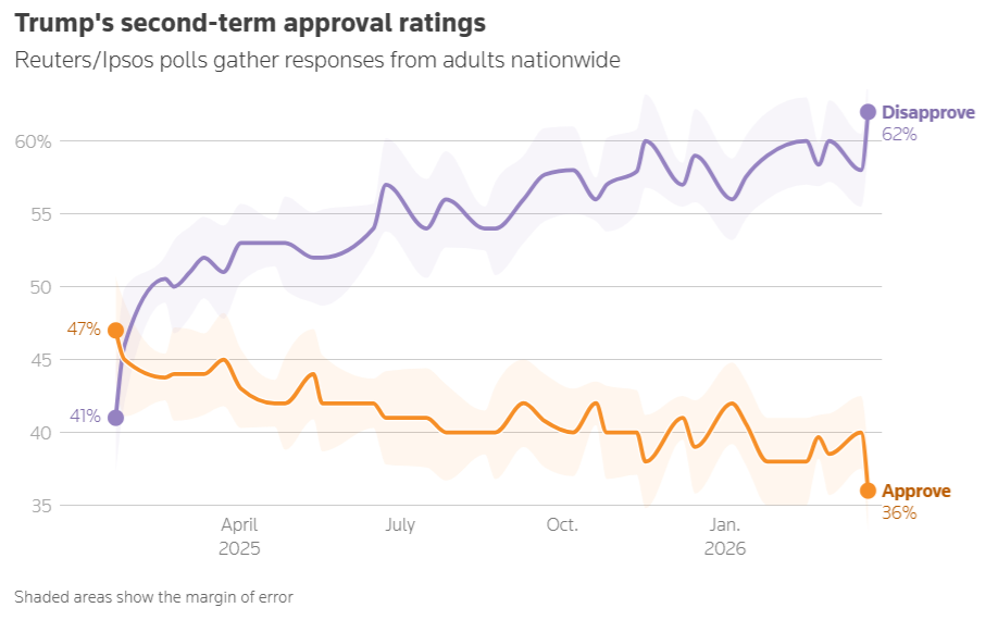 Рейтинг схвалення американського президента Дональда Трампа за тиждень впав зі 40% до 36%. Це є найнижчим рівнем із моменту його обрання в січні 2025 року.