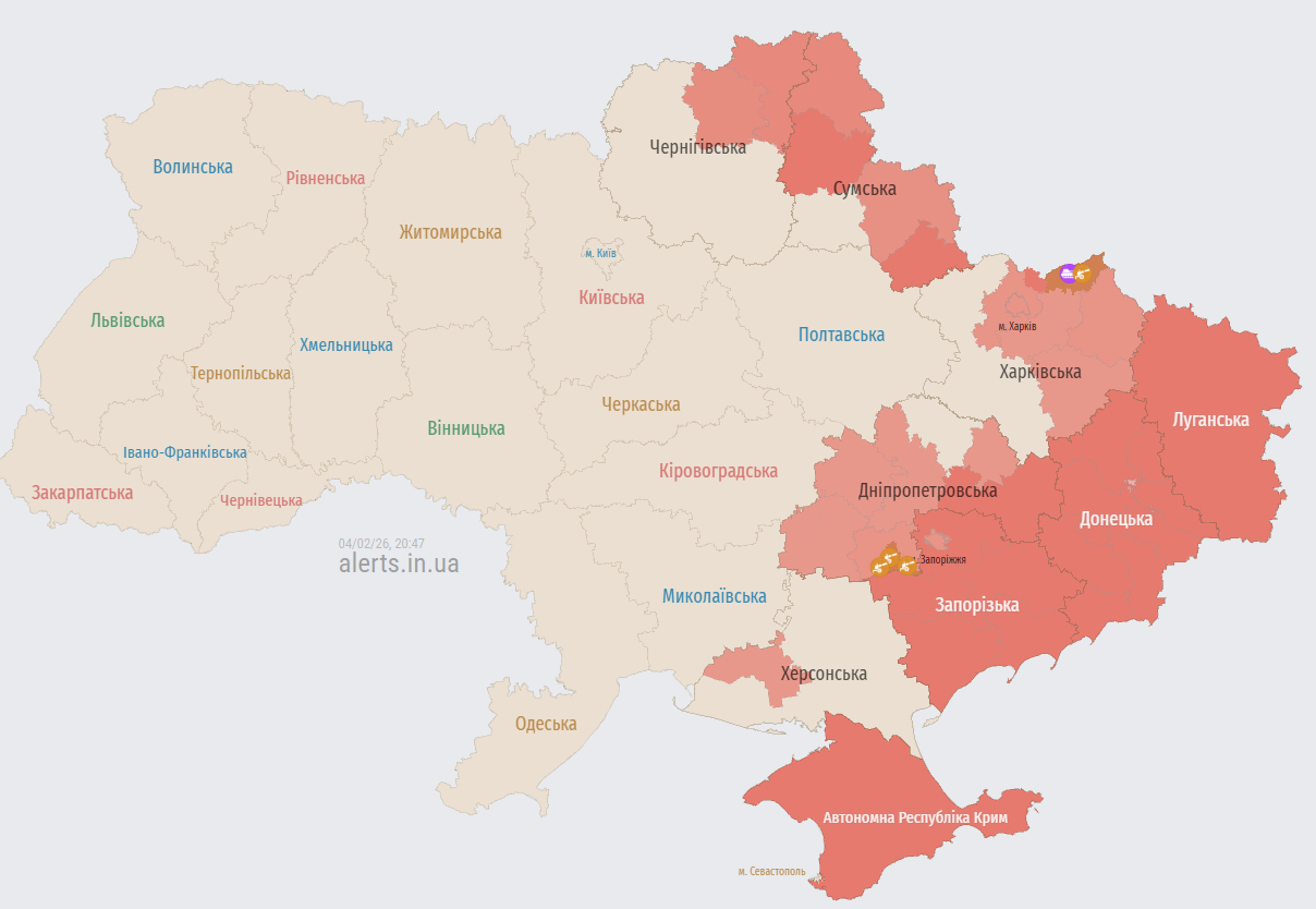 Увечері 4 лютого російські війська здійснюють чергову повітряну атаку на українські міста, застосовуючи швидкісні цілі та ударні безпілотники. Повітряна тривога охопила низку областей, а загроза балістичного озброєння змусила мешканців перебувати в укриттях.