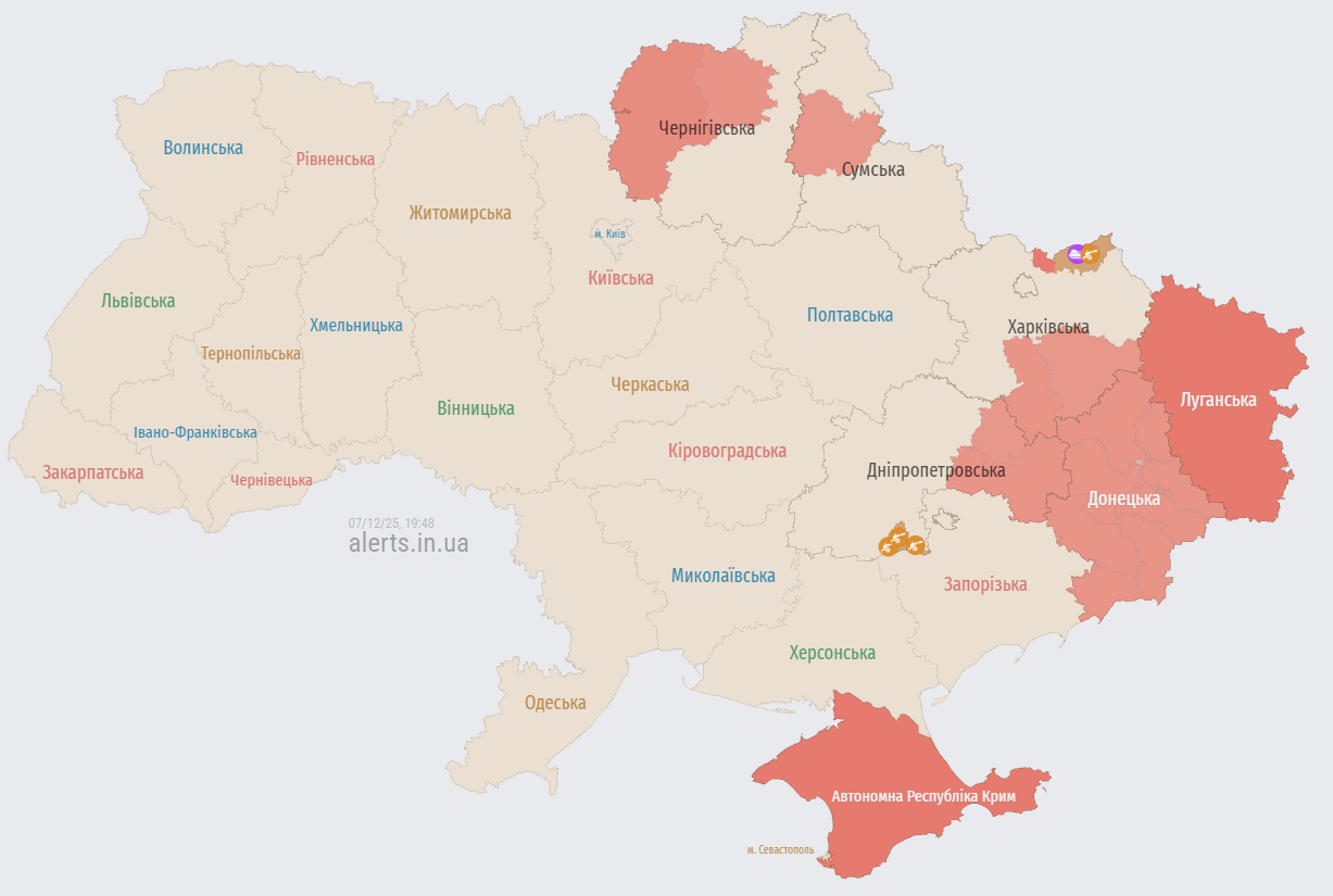 Мапа повітряних тривог станом на 19:45 має такий вигляд: