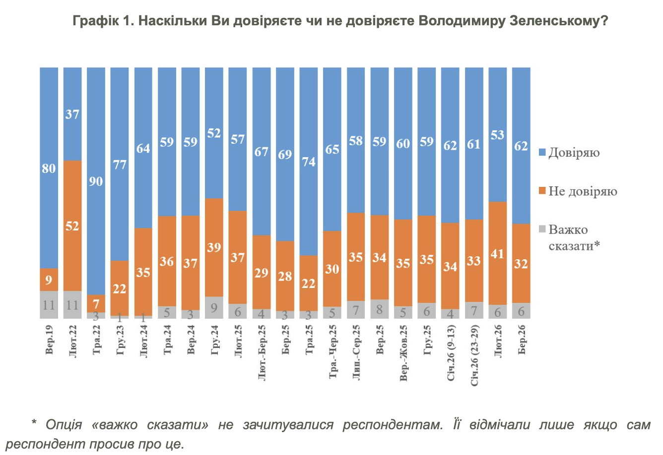 Станом на початок березня 62% українців довіряють президенту Володимиру Зеленському. Це на 9 відсоткових пунктів більше, ніж у лютому, коли рівень довіри знижувався.