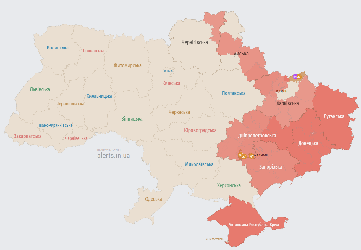 Увечері 5 лютого російські окупаційні війська здійснюють масовану атаку на низку регіонів України, застосовуючи ударні безпілотники та тактичну авіацію. Під ударом опинилися прифронтові області, а також центральні та південні райони країни, де зафіксовано рух ворожих дронів та пуски керованих авіаційних бомб.