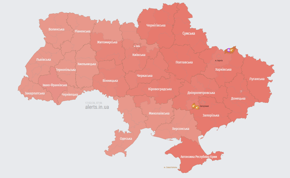 Повітряна тривога на території всієї України станом на 07:11 мала такий вигляд: