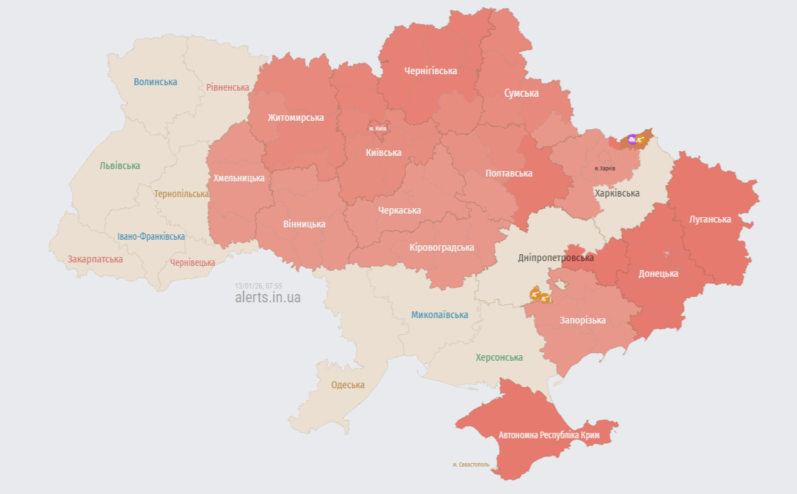 У вівторок, 13 січня, зранку Росія запустила по Україні крилаті ракети. Їх фіксують у повітряному просторі. Водночас Київ атакують дрони, працює протиповітряна оборона.
