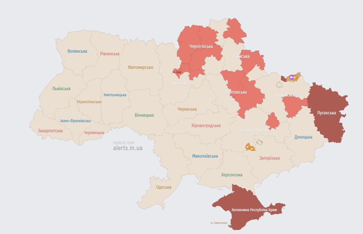 Ввечері 29 вересня у Києві та низці областей. Рашисти атакують Україну ударними дронами.