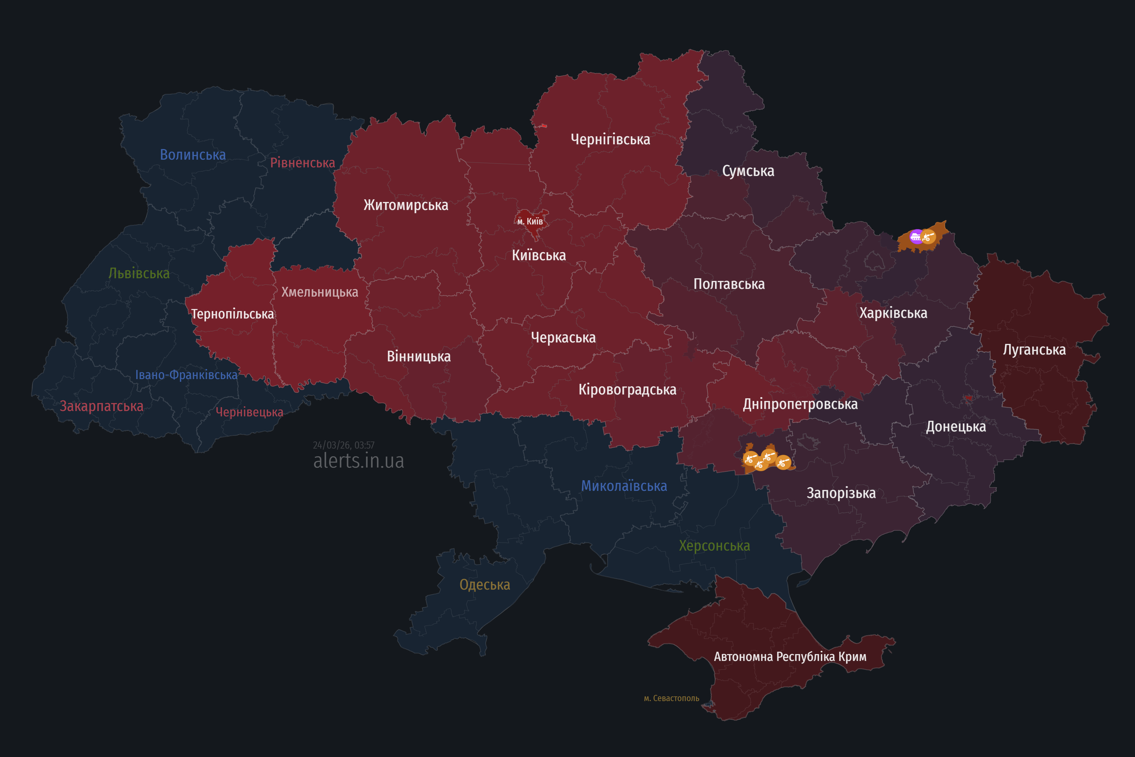 Водночас Повітряні сили повідомляють, що росіяни здійснили пуски крилатих ракет із літаків стратегічної авіації Т-95МС й Ту-160МС. Повітряна тривога шириться країною — "червоніють" вже й західні області.