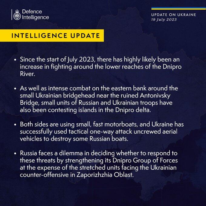 У липні значно зросла інтенсивність боїв в районі течії Дніпра. Це спричинило додаткову напругу для російської армії, яка тепер стоїть перед вибором, чи варто посилювати там своє угрупування військ.