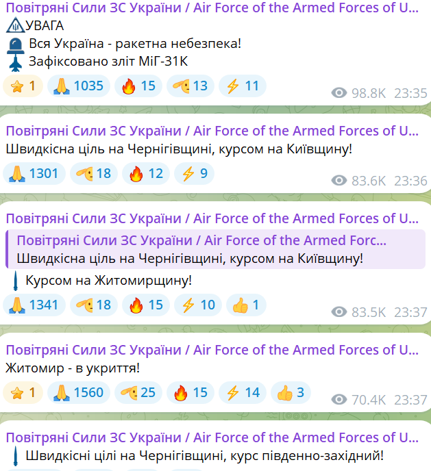 Пізно ввечері у неділю, 2 листопада, російські загарбники підняли у повітря МіГ-31К — основний носій гіперзвукового авіаційного ракетного комплексу Х-47м2 "Кинджал". По всій Україні оголосили повітряну тривогу.