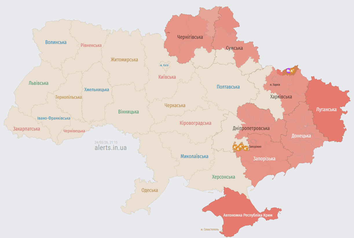Увечері 24 березня окупаційні війська Росія здійснюють масштабний запуск ударних дронів по низці українських областей. Військові фіксують рух безпілотників у напрямку великих міст та районних центрів.