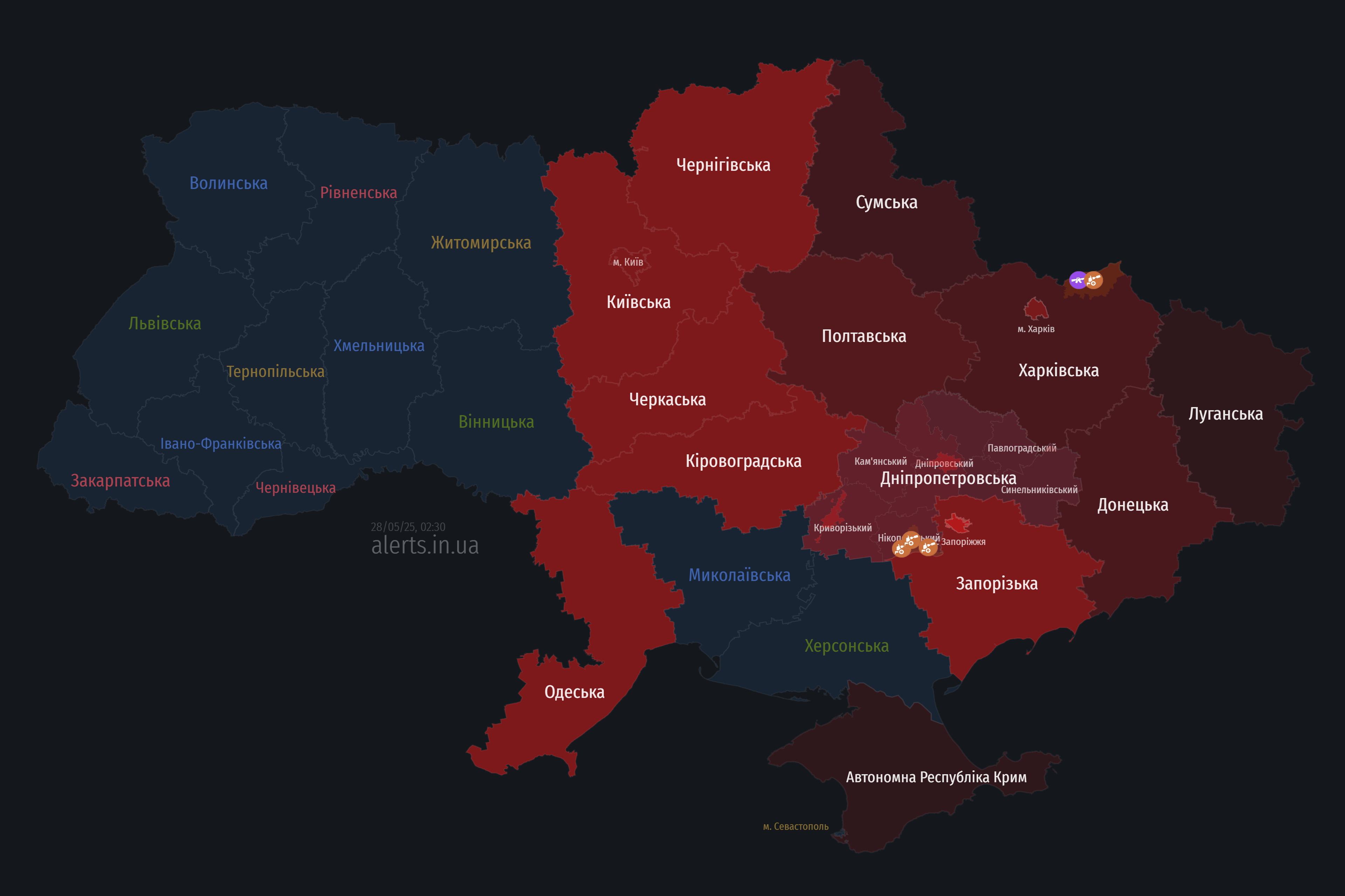 У ніч на середу, 28 травня, у Києві та низці областей оголосили повітряну тривогу. Небезпека пов'язана із балістичною загрозою з північного напрямку.