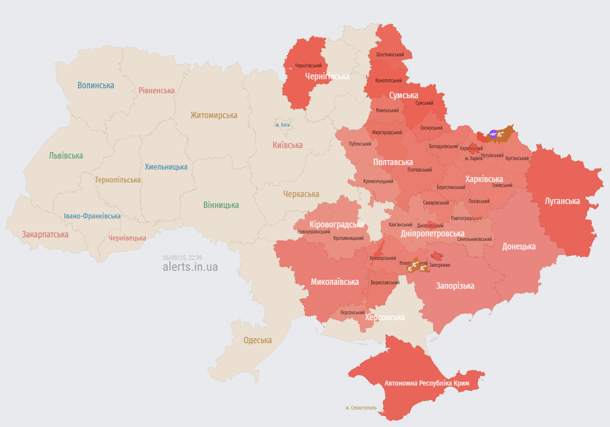 У п'ятницю ввечері, 26 вересня, в українському повітряному просторі фіксуються ворожі ударні безпілотники. Сирени лунають у низці областей.