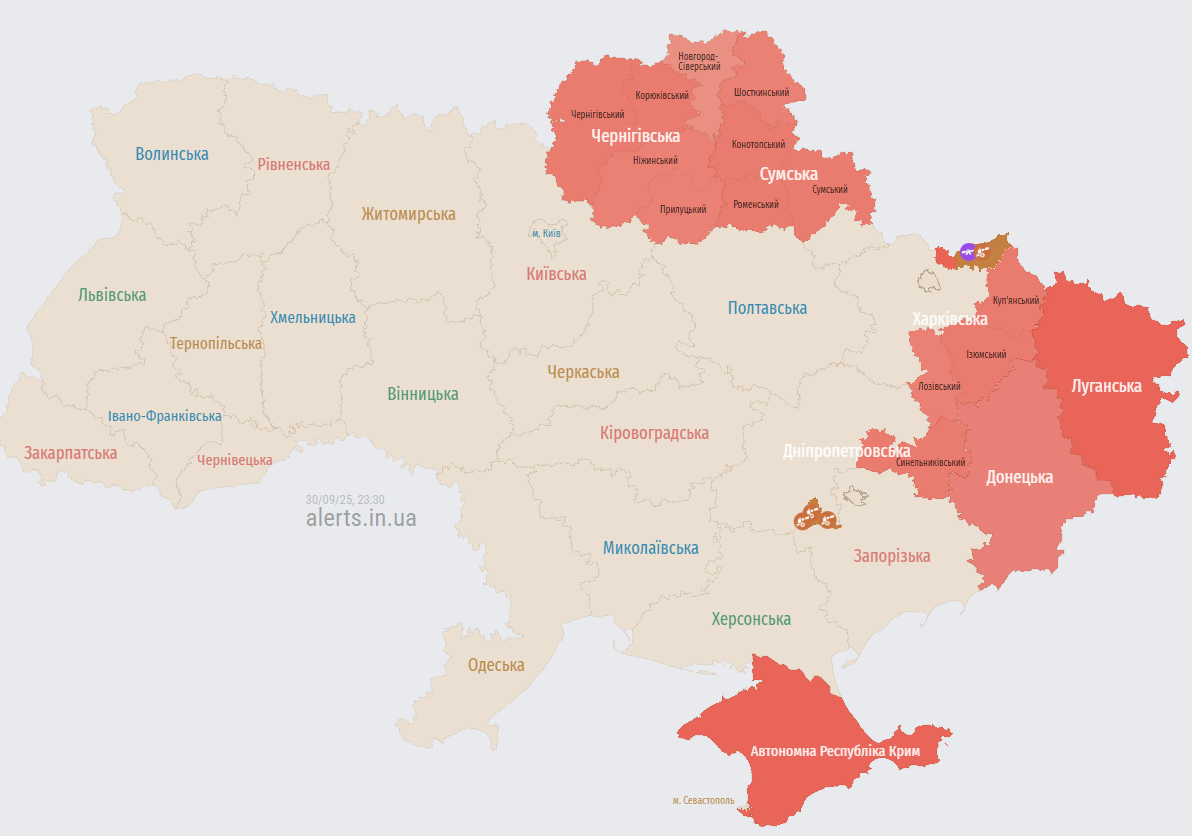 У вівторок ввечері, 30 вересня, російська армія атакує Україну ударними безпілотниками. Повітряна тривога оголошена у низці областей.
