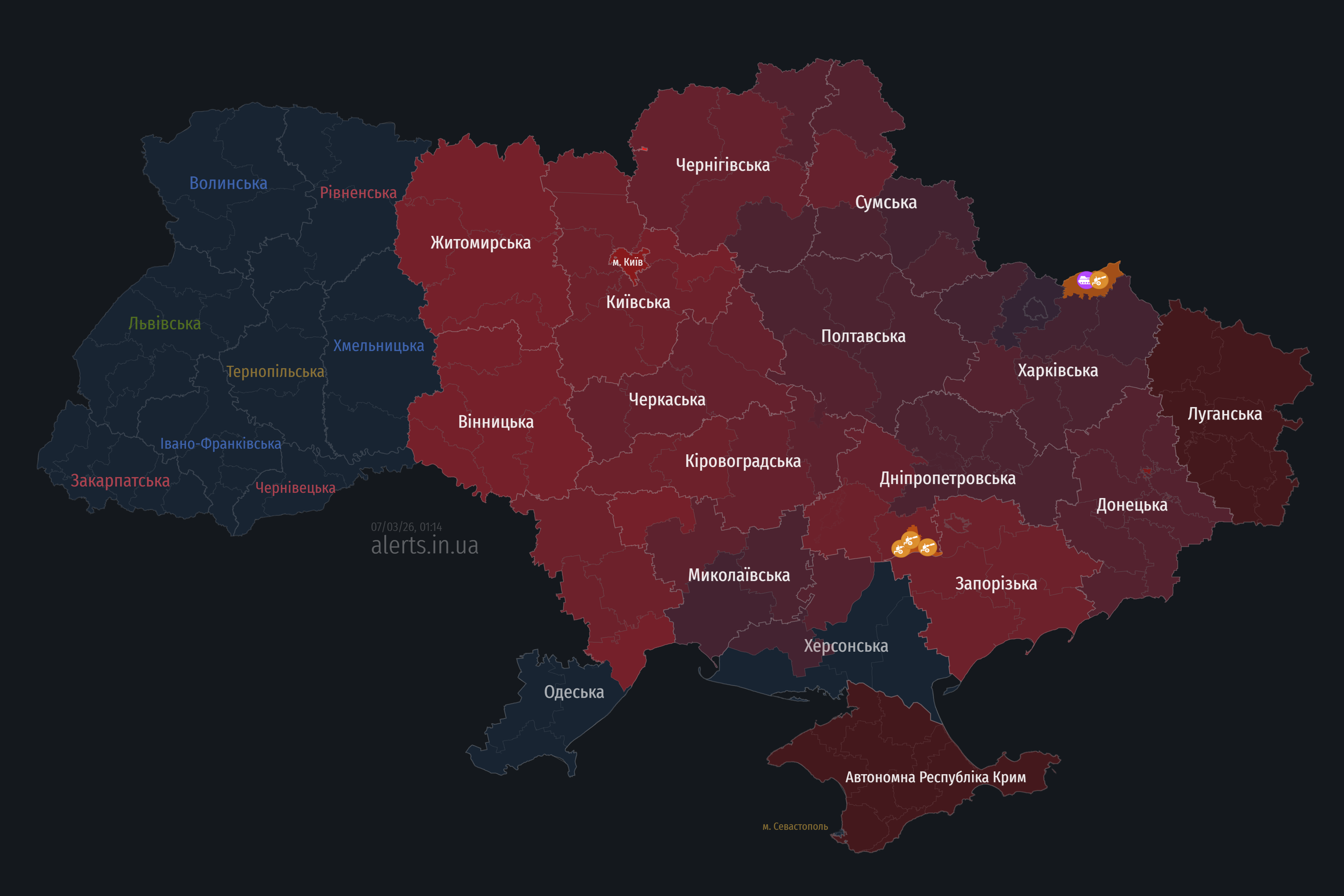 У ніч на суботу, 7 березня, російські загарбники масовано атакують Україну ударними безпілотниками типу "Шахед". Ворожі дрони фіксують у небі над низкою областей. У більшості регіонів оголошено повітряну тривогу.
