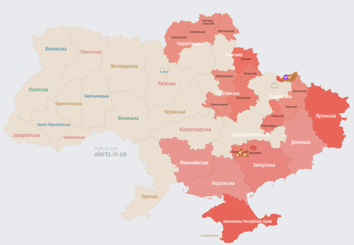 У середу ввечері, 24 вересня, російська армія атакує Україну ударними безпілотниками. Ворожі дрони прямують одразу з кількох напрямків.
