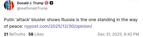 У середу, 31 грудня, американський президент Дональд Трамп різко розкритикував останню риторику Кремля про нібито українську атаку на резиденцію глави Кремля Володимира Путіна, заявивши, що саме дії Російської Федерації є головним бар'єром для завершення війни.