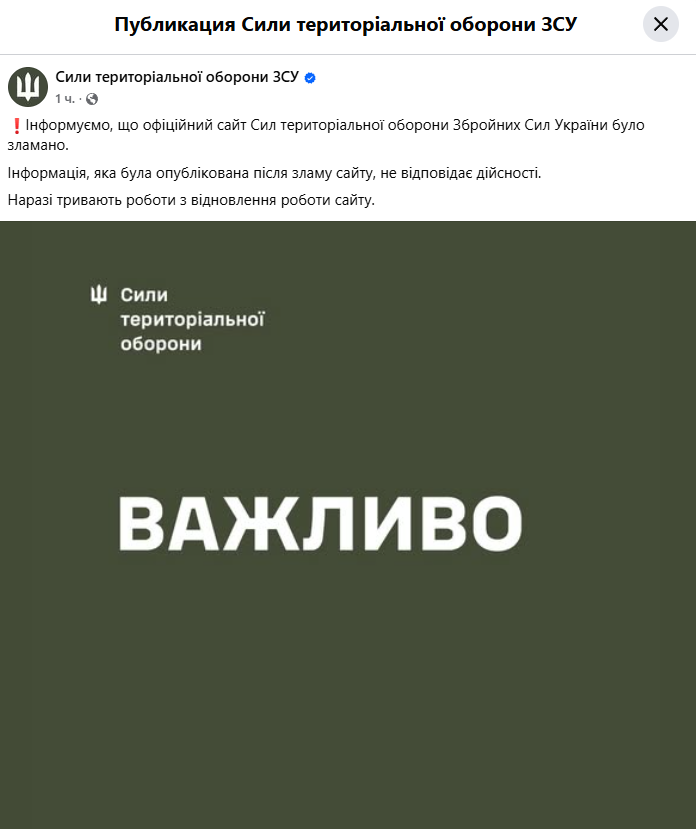 "Інформуємо, що офіційний сайт Сил територіальної оборони Збройних Сил України було зламано. Інформація, яка була опублікована після зламу сайту, не відповідає дійсності. Наразі тривають роботи з відновлення роботи сайту", — повідомили військові.