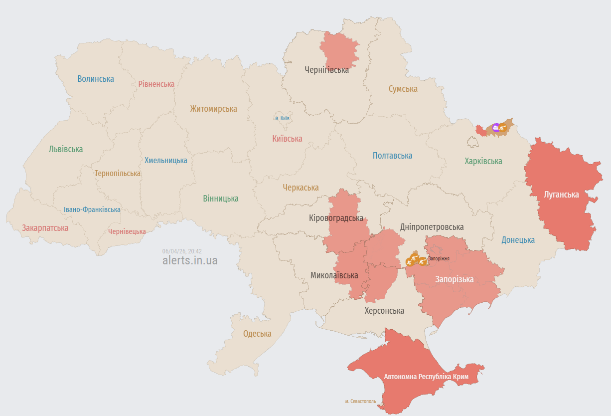 Російські окупаційні війська 6 квітня запустили кілька груп ударних безпілотників та швидкісні цілі по території України. Загроза поширилася на південні, центральні та північні регіони країни.