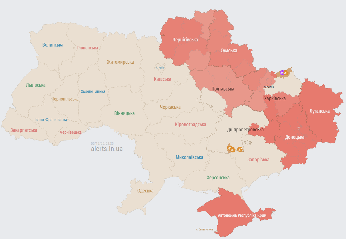 У п'ятницю ввечері, 5 грудня, російська армія атакує Україну ударними безпілотниками. Повітряну тривогу оголошено у низці областей.