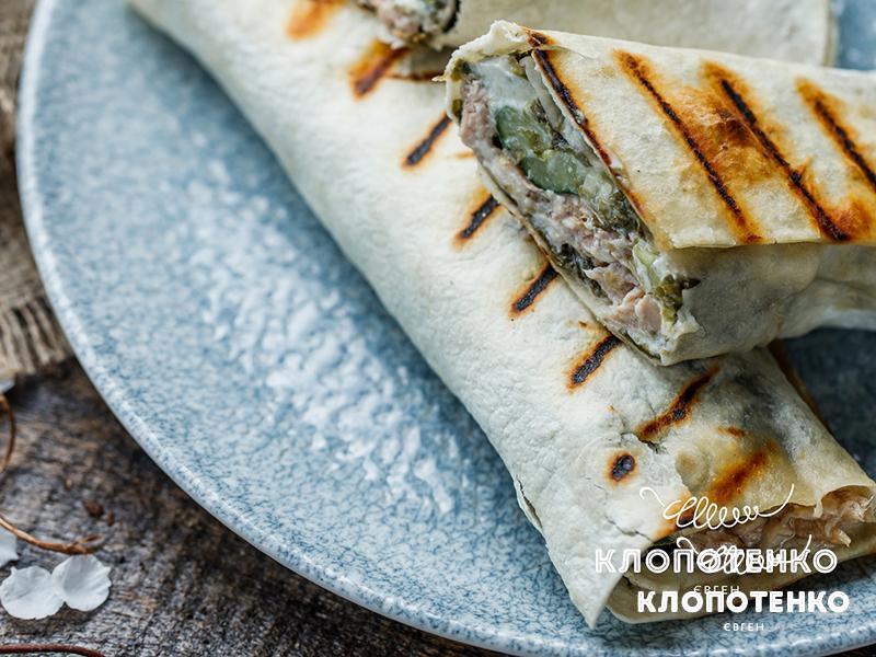 - Завернути лаваш у вигляді ролу та підсмажити на решітці гриля по хвилині з кожного боку.