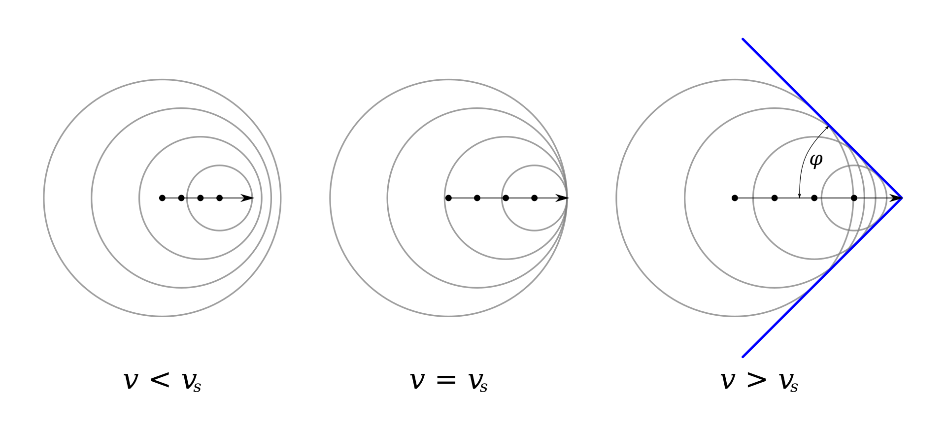 У момент, коли ударна хвиля, яка поширюється у вигляді конуса, досягає вуха спостерігача, то він чує гучний "хлопок" або навіть "вибух", адже у повітрі виникає специфічний розподіл тиску. Втім, це не справжній вибух, а акустичне явище, спричинене високою швидкістю об'єкта.