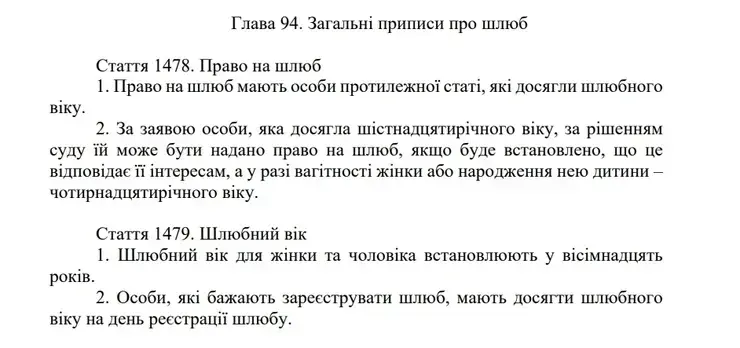 Варто зауважити, що цей документ перебуває на етапі опрацювання, остаточне рішення щодо змін ще не ухвалене. Наразі в Україні згідно з законодавством дозволено укладати шлюб із 18 років, за рішенням суду — з 16 років, якщо доведено, що це відповідає інтересам неповнолітньої особи.