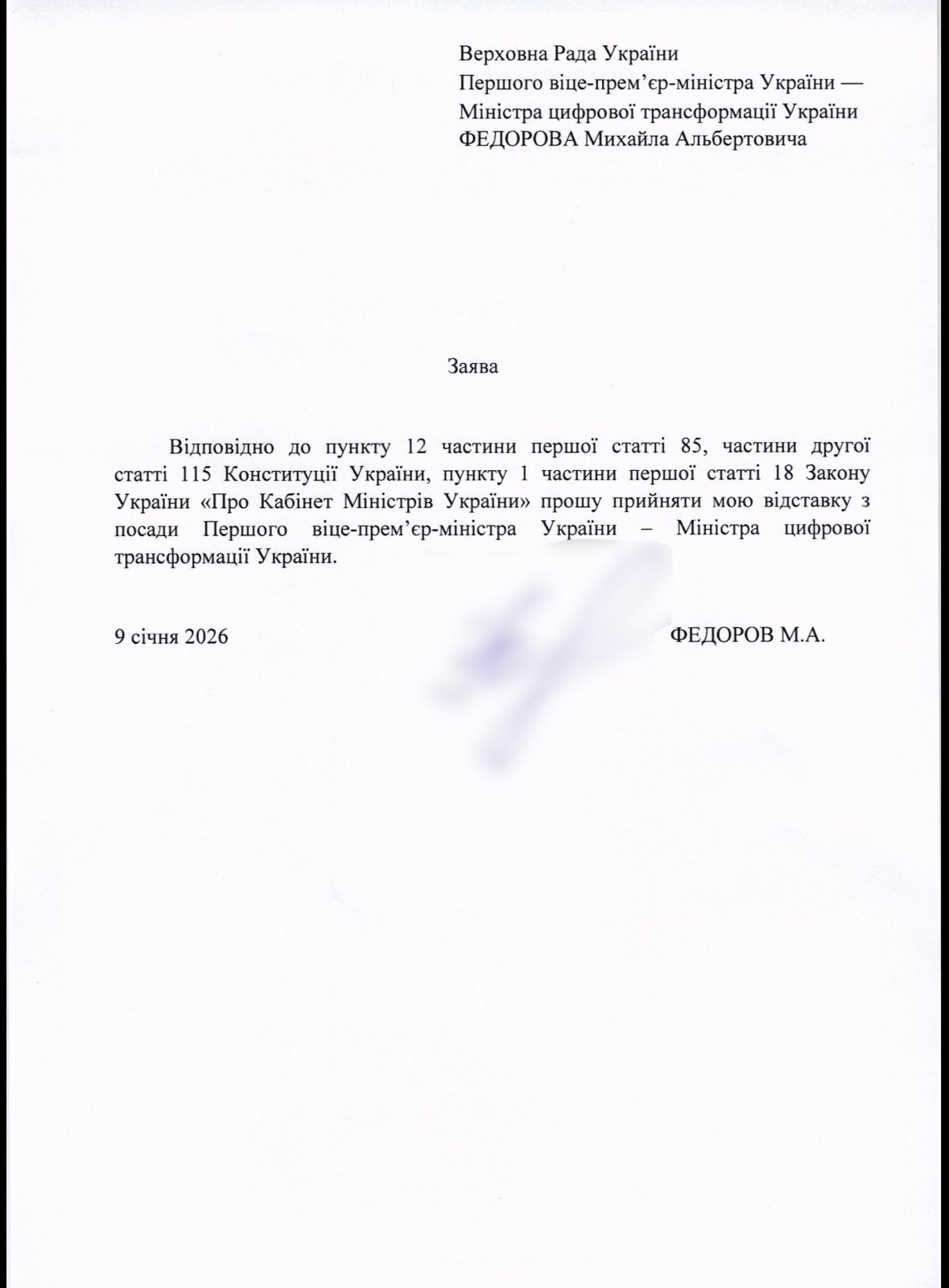 "До Верховної Ради України надійшла заява про відставку першого віце-прем’єр-міністра України — міністра цифрової трансформації України Михайла Федорова", — зазначив він.