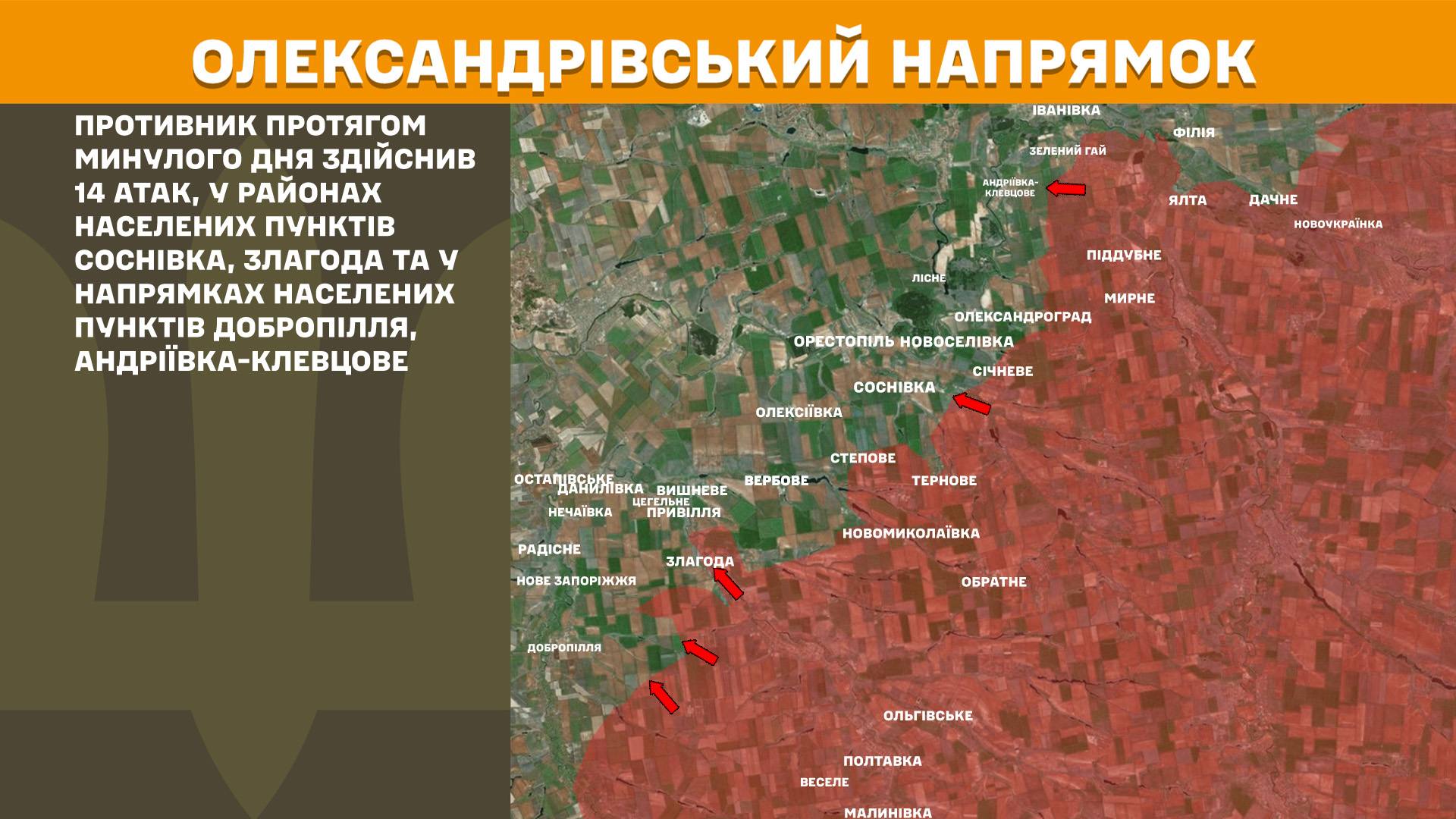 На Олександрівському напрямку противник протягом минулого дня здійснив 14 атак, у районах населених пунктів Соснівка, Злагода та у напрямках населених пунктів Добропілля, Андріївка-Клевцове.
