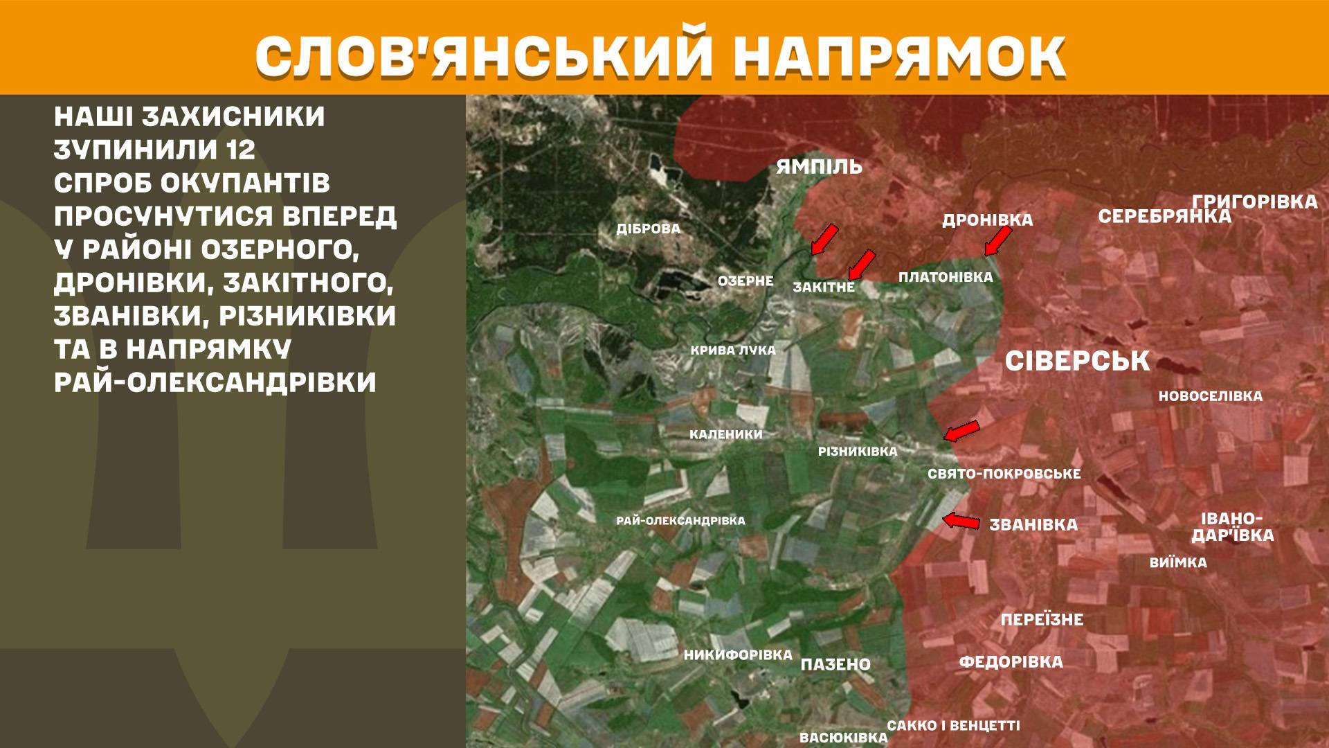 На Слов’янському напрямку протягом вчорашньої доби наші захисники зупинили 12 спроб окупантів просунутися вперед у районі Озерного, Дронівки, Закітного, Званівки, Різниківки та в напрямку Рай-Олександрівки.