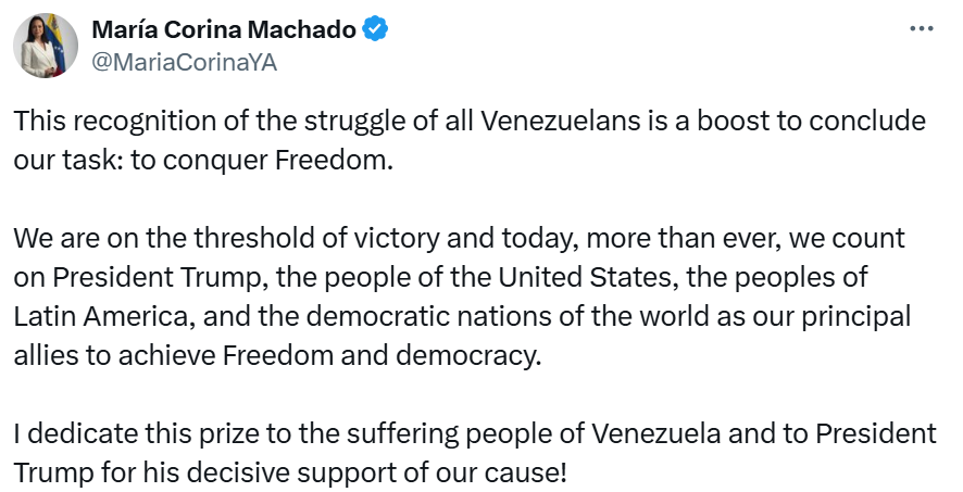 У 2024 році популярна в народі правозахисниця виграла праймеріз опозиції, проте диктатура заборонила їй балотуватися в президенти, звинувативши у закликах до масових протестів. На неї полюють силовики Мадуро, через це Мачадо вимушена переховуватися. У Нобелівському комітеті не впевнені, що лауреатка зможе особисто прибути для отримання нагороди. А Трамп у 2024 році вдруге виграв президентські вибори на відвертому популізмі. Зараз він погрожує владі Венесуели, вимагає від неї приймати депортованих зі США венесуельських мігрантів, американські військові вже двічі атакували човни, які запідозрили у перевезенні наркотиків. Але при цьому дуже болісно відреагував на отримання премії миру лідеркою опозиції режиму Мадуро.