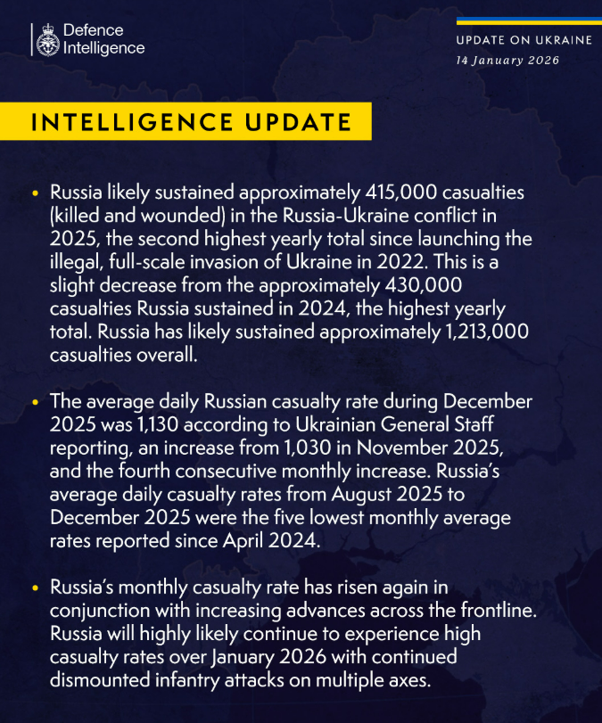Загалом, за підрахунками британських розвідників, сукупні втрати Росії з початку повномасштабної війни, ймовірно, сягнули близько 1 мільйона 213 тисяч військових. Водночас у розвідувальному відомстві Британії відзначили, що, за даними Генерального штабу ЗСУ, середньодобові втрати РФ у грудні 2025 року становили близько 1 130 осіб, що перевищує показник листопада 2025 року (1 030 осіб) і стало четвертим поспіль місячним зростанням втрат.