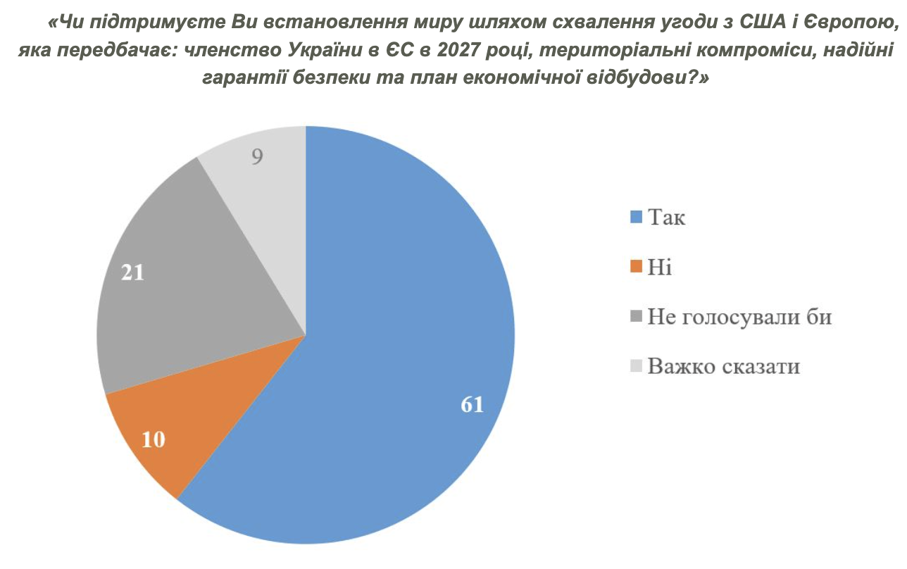Експериментальне формулювання запитання, яку КМІС використовував для перевірки реакції населення, звучала так: "Чи підтримуєте Ви встановлення миру шляхом схвалення угоди з США і Європою, яка передбачає: членство України в ЄС у 2027 році, територіальні компроміси, надійні гарантії безпеки та план економічної відбудови?" У цьому випадку 61% респондентів сказали б "так", 10% — "ні", решта не визначилися або не брали б участь у голосуванні. Якщо рахувати лише тих, хто дійсно прийде на референдум, підтримка зростає до 86%, проти — 14%.