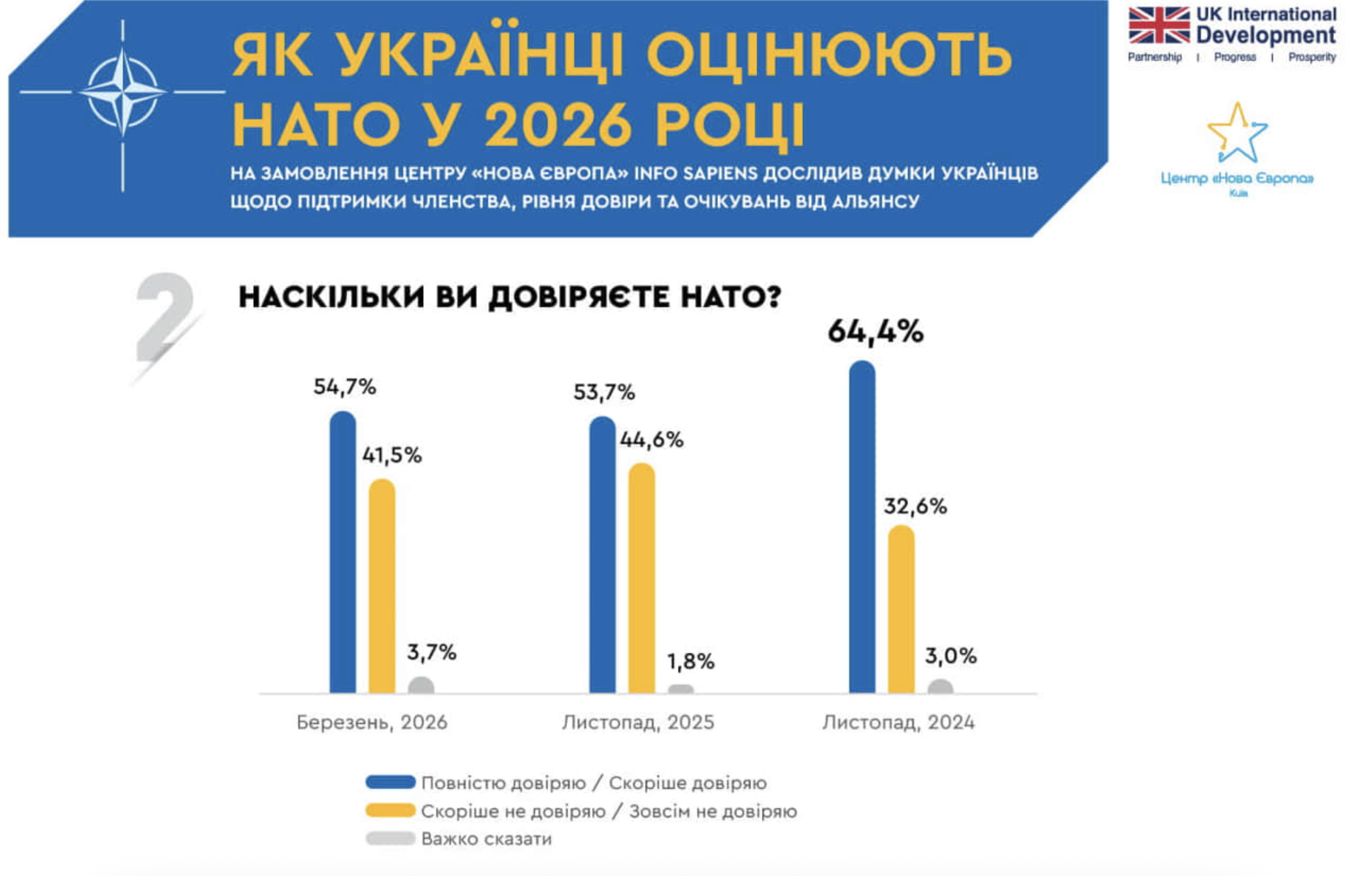Більшість громадян України підтримують вступ країни до НАТО, однак рівень довіри до самого Альянсу суттєво нижчий. Про це свідчить опитування, проведене на замовлення центру "Нова Європа" дослідницькою агенцією Info Sapiens.