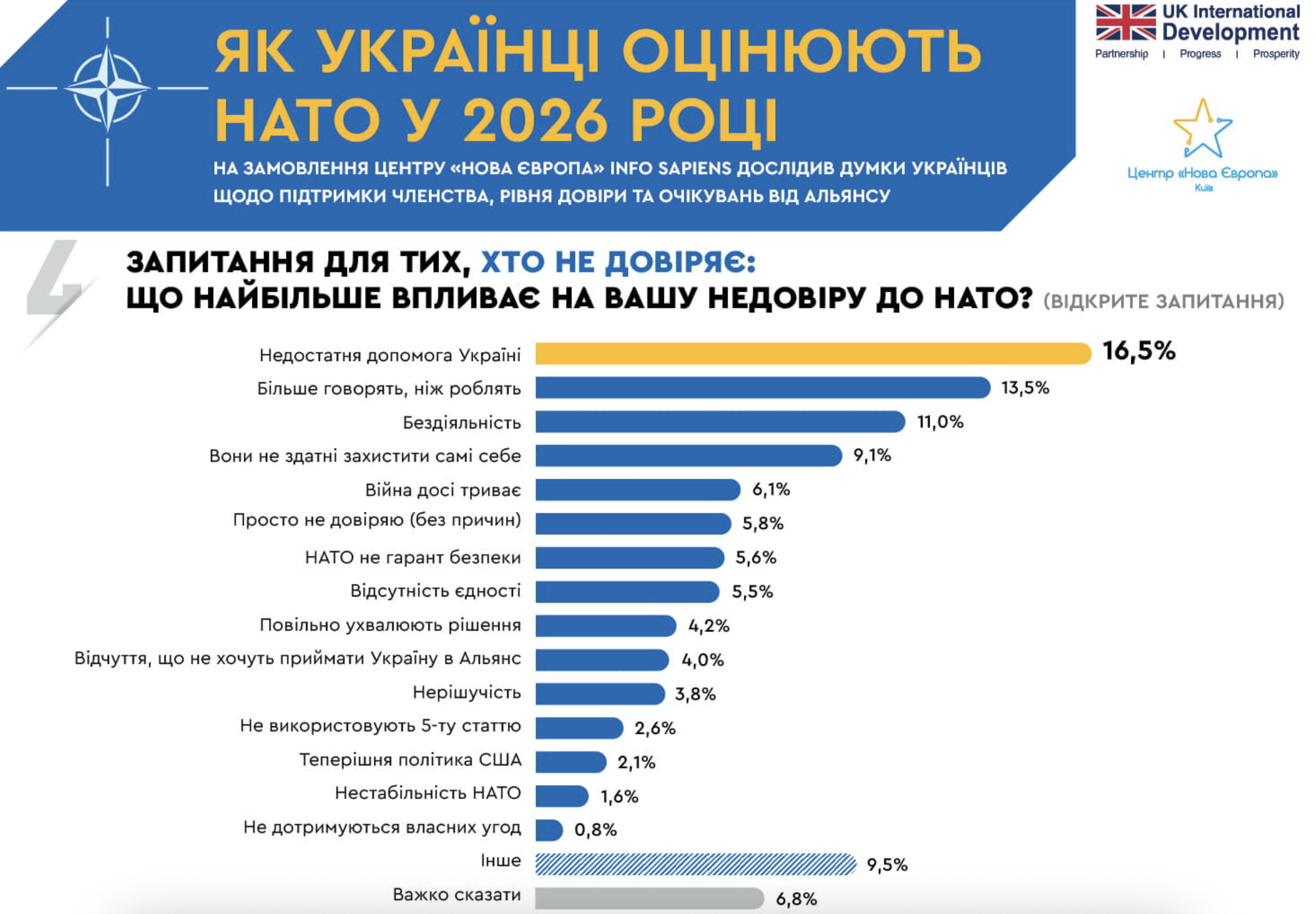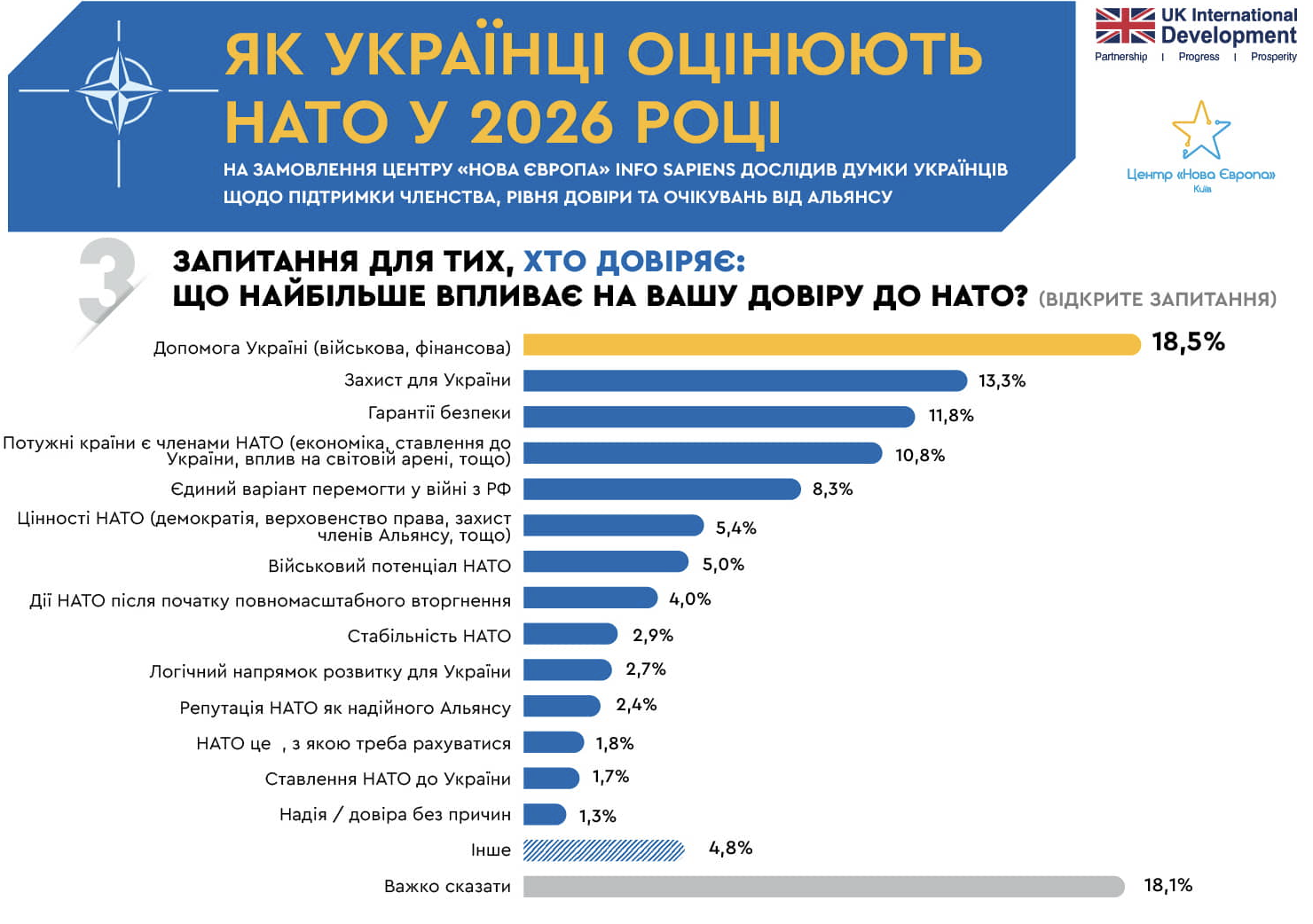Дослідники зазначають, що ставлення українців до НАТО значною мірою залежить від практичної військової та політичної підтримки. Водночас Альянс залишається для більшості символом потенційних гарантій безпеки, попри неоднозначну оцінку його дій у війні.