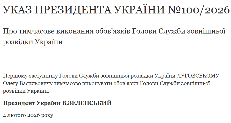 Про це йдеться на сайті президента України, де оприлюднено текст відповідного указу №100/2026 від 4 лютого 2026 року. Згідно з документом, на Луговського Олега Васильовича покладено виконання обов’язків голови СЗР на тимчасовій основі.