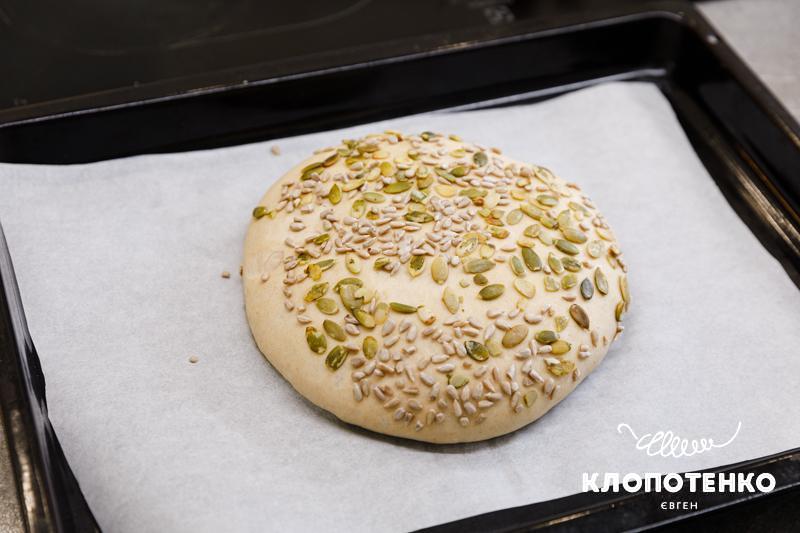 - За допомогою кулінарного пензлика, змастити хліб водою та присипати зверху насіння.