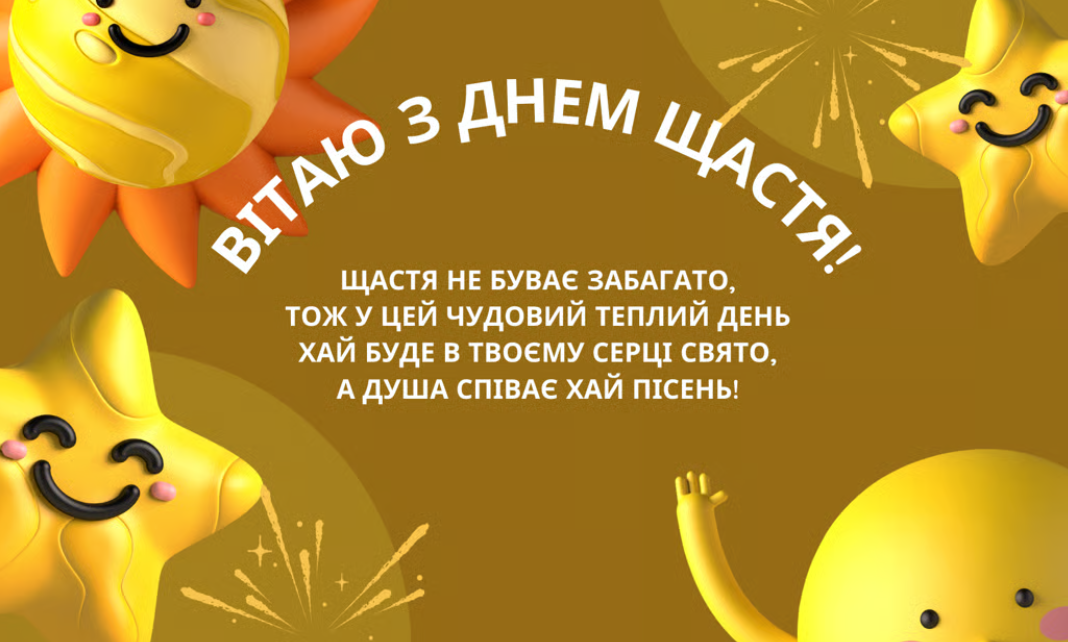 З Днем щастя! Хай воно буде у кожного своє — головне, щоб воно було! Бажаю, щоб у всьому, що тебе оточує, ти знаходив радість, любов та натхнення. Бажаю, щоб ти завжди був життєрадісним!