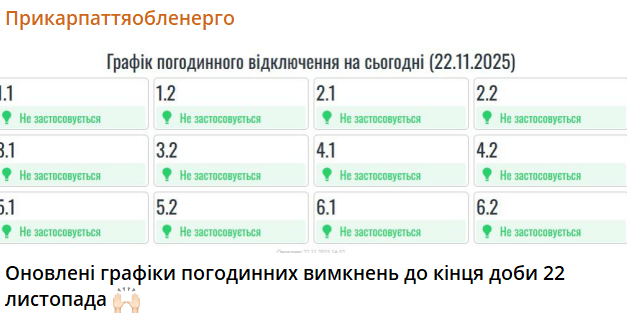 На Івано-Франківщині 22 листопада також скасували графіки погодинних вимкнень електроенергії. За даними "Прикарпаттяобленерго", світло буде до кінця доби.