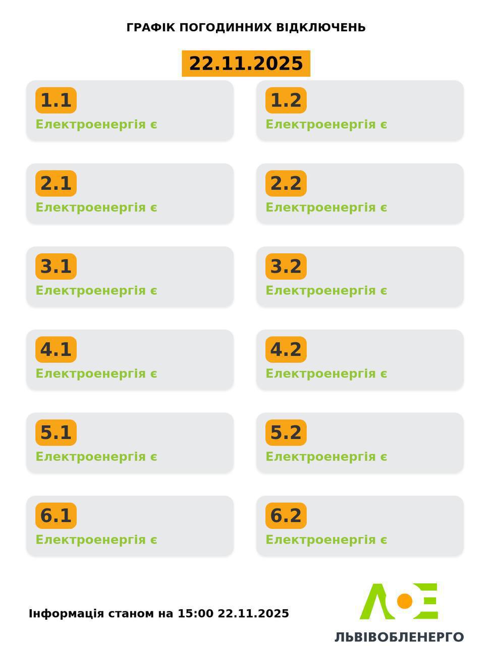 Про це повідомляють місцеві обленерго. Згідно з оприлюдненою інформацією на сайті "Львівобленерго", у суботу графіки знеструмлень скасовані для Львівської області.