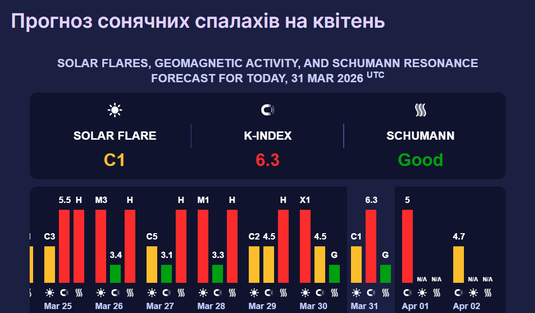 А вже у четвер, 2 квітня, сонячна активність спаде до 4,7 бала. Такий показник відповідає магнітній бурі жовтого рівня, яка також може позначитися на самрпочутті, тож варто більше відпочивати та віддавати перевагу корисній їжі.