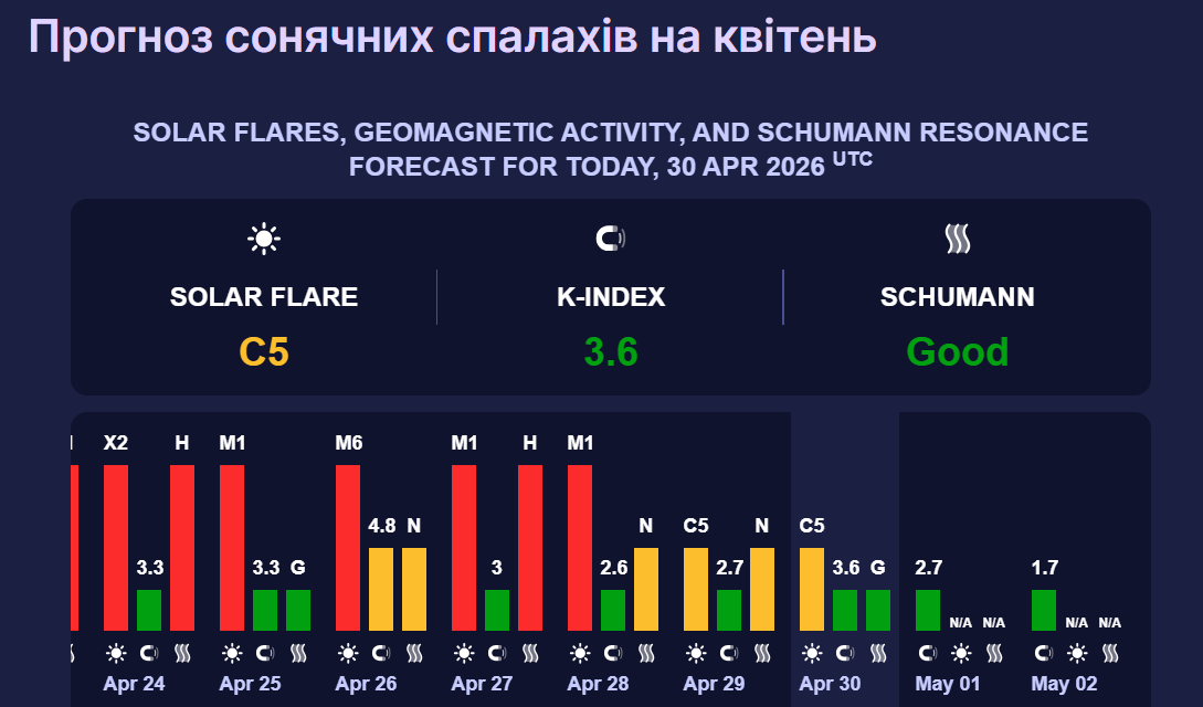 Згідно з нинішніми прогнозами фахівців, 1 травня космічний шторм становитиме 2,7 бали (зелений рівень). Такий К-індекс відповідає магнітній бурі низької потужності. Вона не впливає на здоров’я метеозалежних осіб.