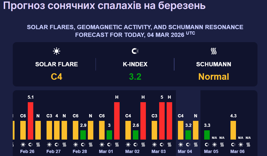 У п'ятницю, 6 березня, сонячна активність зросте до 4,2 бала. Такий показник відповідає магнітній бурі жовтого рівня. Вона може викликати головний біль, апатію або зниження працездатності.