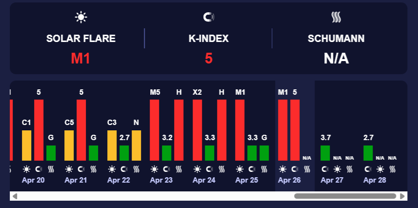 На понеділок, 27 квітня, фахівці прогнозують низьку магнітну активність. На Землі очікується сонячна активність із К-індексом 3,7 (зелений рівень). Він відповідає слабким магнітним бурям.