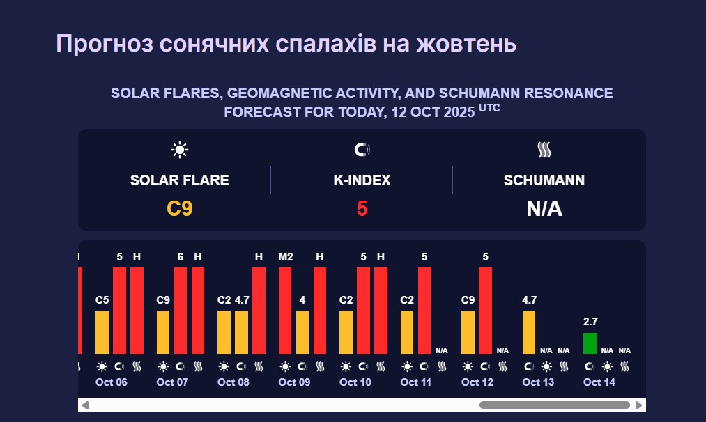 Водночас вже у вівторок, 14 жовтня, ситуація дещо покращиться і сонячна активність зменшиться до 2,7 бала (зелений рівень).
