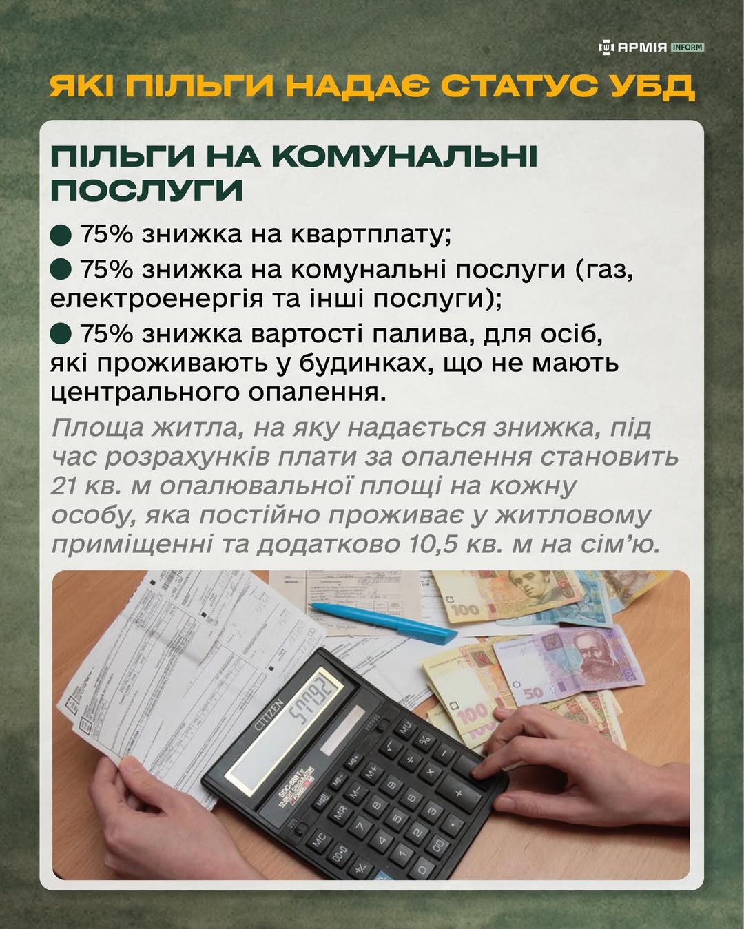 - 75% знижки на оплату комунальних послуг (газ, електроенергія та інші послуги);