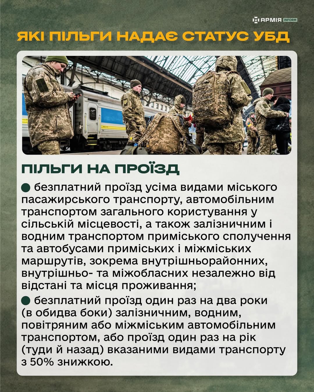 Військовослужбовці Збройних сил України та інших військових формувань, які брали або беруть участь у бойових діях, мають право на отримання статусу учасника бойових дій (УБД). Цей статус гарантує широкий спектр соціальних пільг — від медичного забезпечення до знижок на комунальні послуги та безплатного проїзду. Протягом останніх років Міністерство оборони України працює над спрощенням та пришвидшенням процедури отримання статусу УБД.