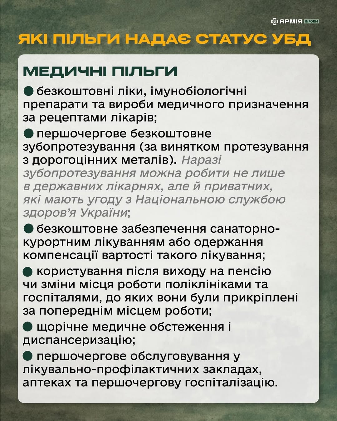 - першочергове безплатне зубопротезування (крім протезування з дорогоцінних металів). Наразі його можна здійснити не лише у державних закладах, а й у приватних клініках, які мають угоду з Національною службою здоровʼя України;