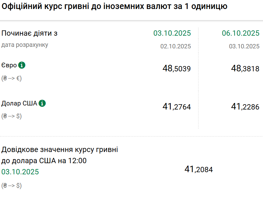 Так, на понеділок, 6 жовтня, Нацбанк встановив офіційний курс на рівні 41,22 гривні за один долар. Офіційний курс у п'ятницю становив 41,27 гривні за один долар. На готівковому ринку долар впав на п'ять копійок — 41,45 гривні.