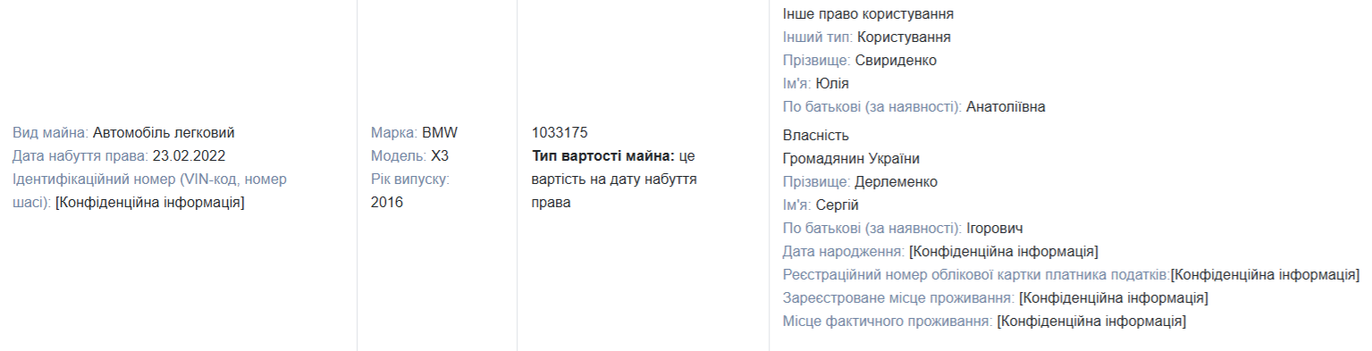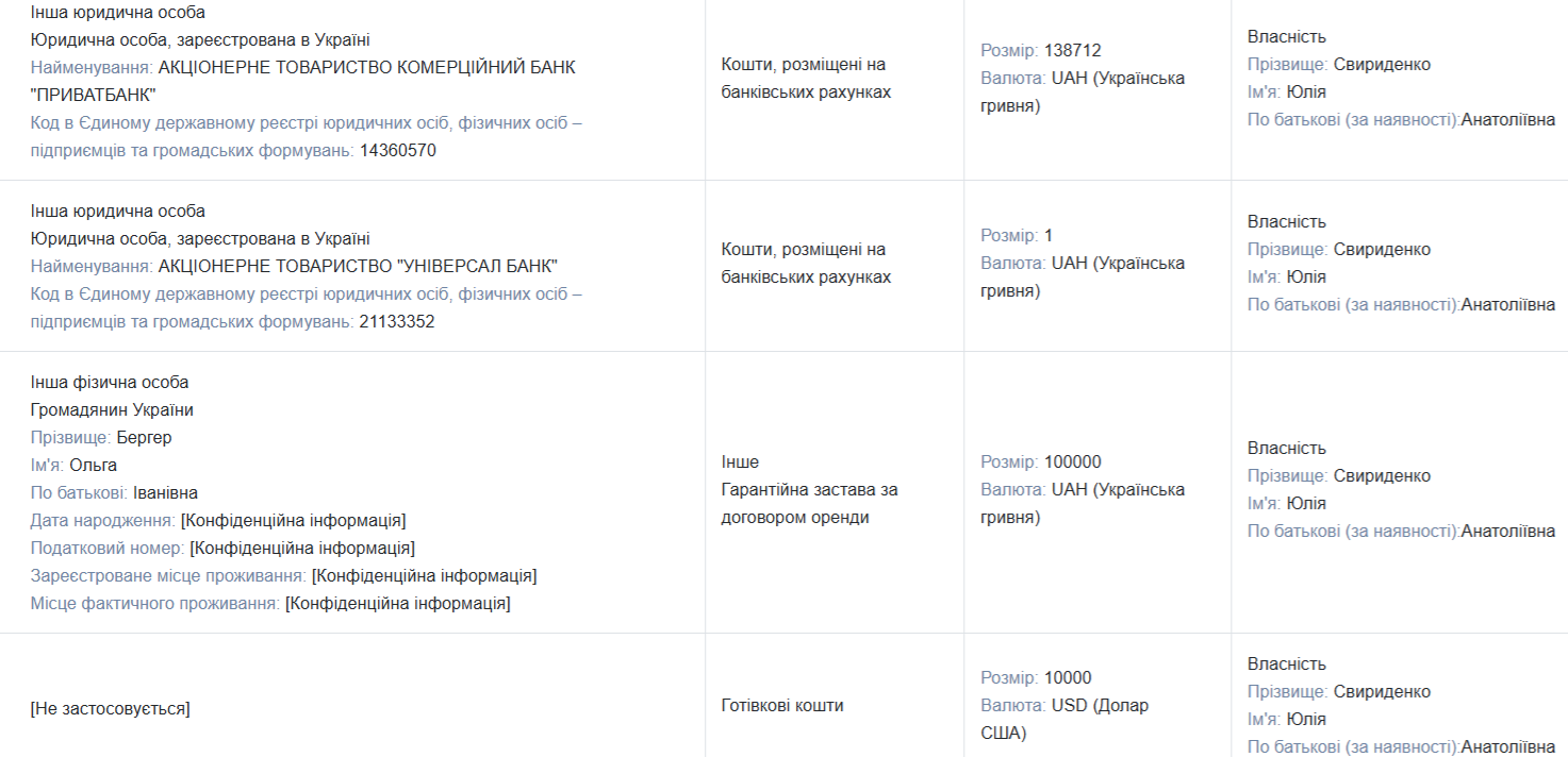 Вона також вказала 138 700 гривень на банківському рахунку в "ПриватБанку", 100 000 гривень — гарантійної застави за договором оренди та 10 000 доларів готівкою.