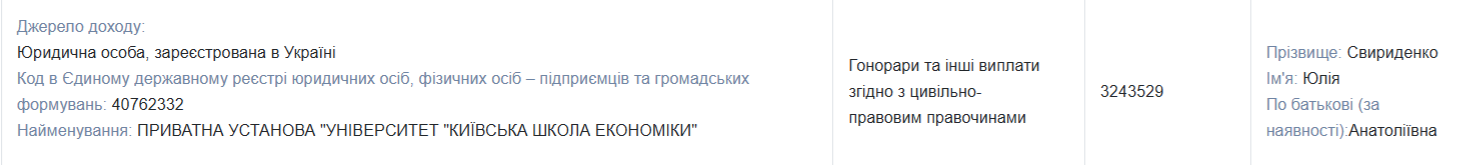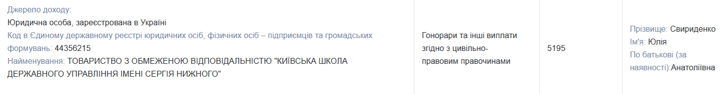 Також у декларації Свириденко з'явився новий невеликий гонорар від Київської школи державного управління імені Сергія Нижного у розмірі 5 195 гривень.