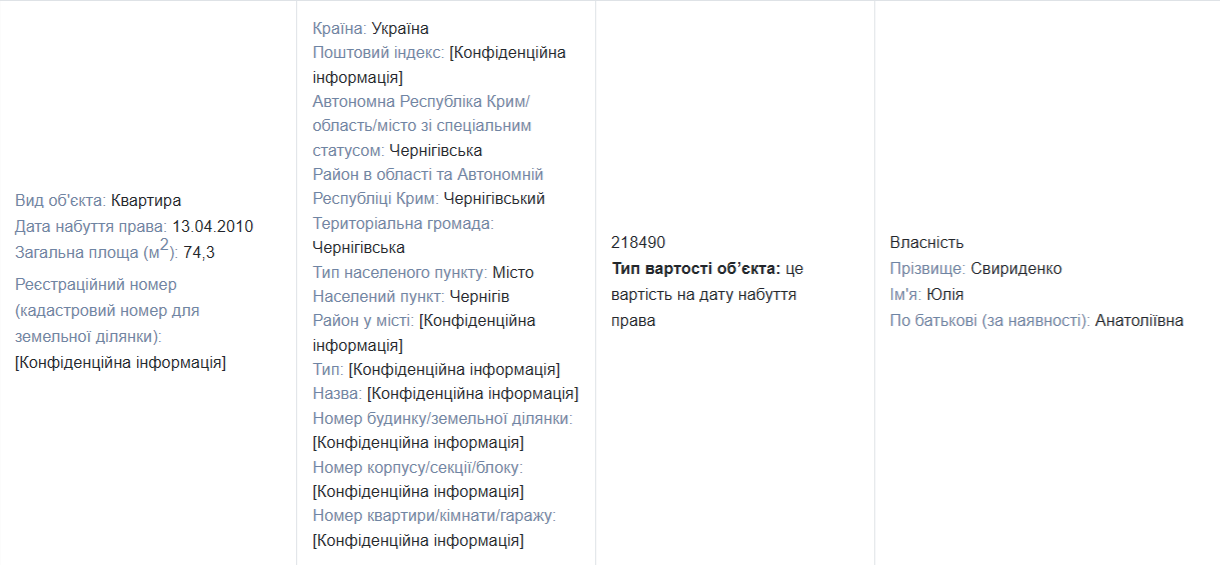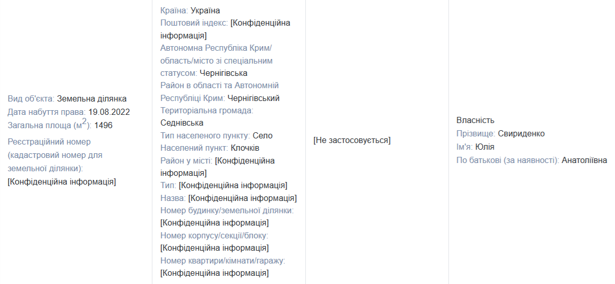 Також вона володіє земельною ділянкою площею 1 496 квадратних метрів у Клочкові Чернігівської області, яку набула 2022 року.